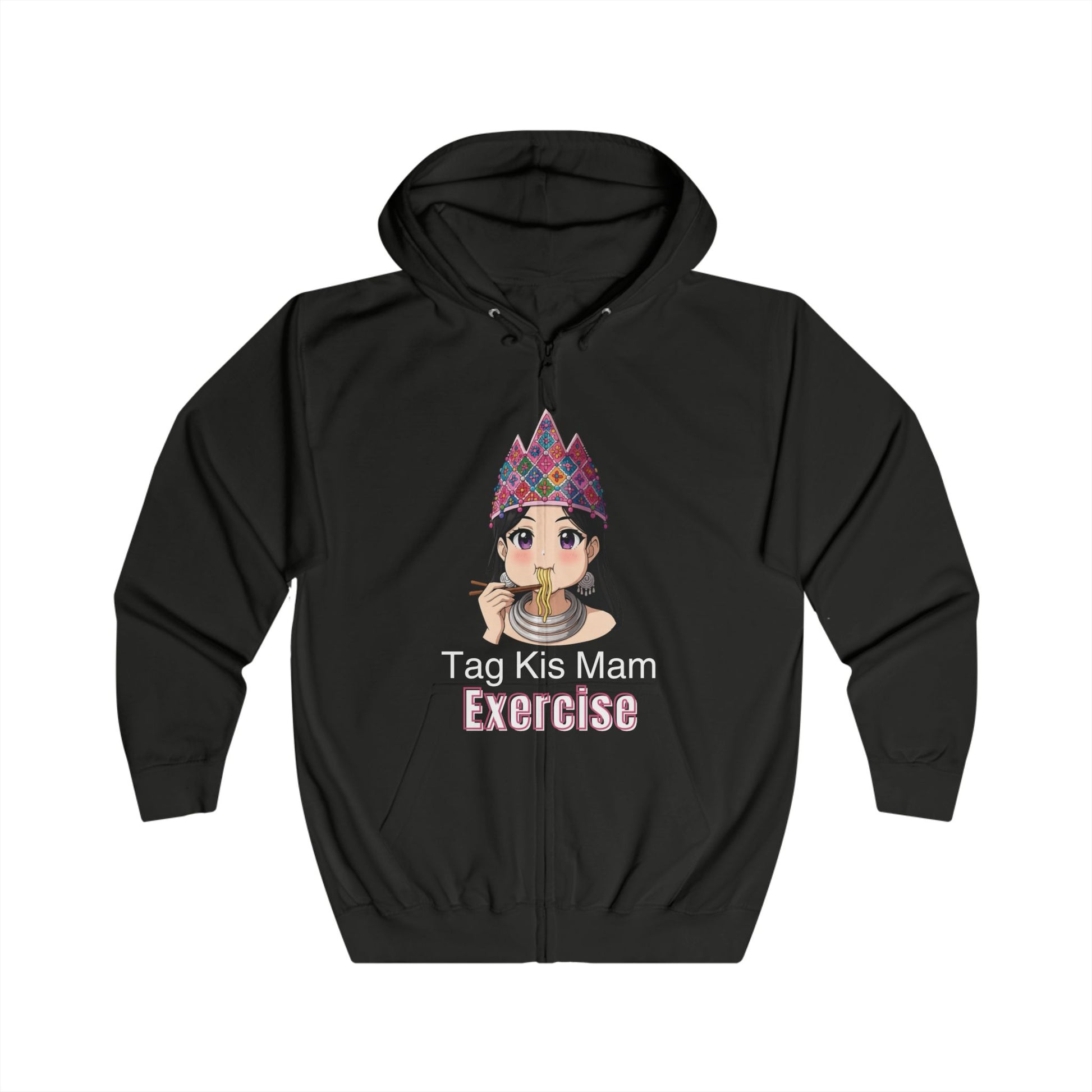 Stay stylish and comfy with a touch of humor in the “Tag Kis Mam Exercise” Women’s Anime Hoodie – Dark Edition. Featuring a playful anime girl in a traditional headpiece enjoying noodles, and the fun Hmong phrase “Tag Kis Mam Exercise” (“I’ll exercise tomorrow”), this hoodie celebrates women who embrace comfort, culture, and a little indulgence.